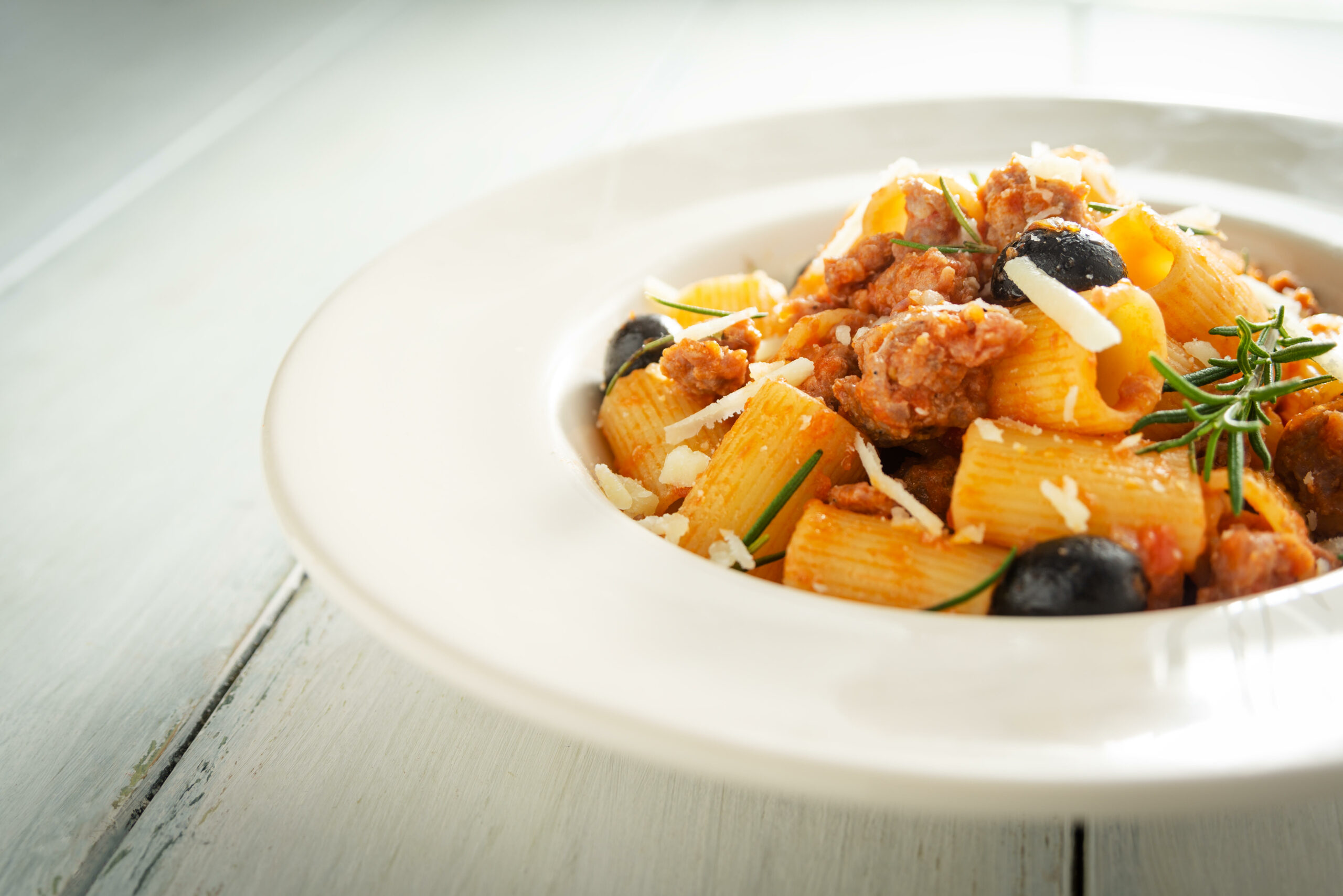 Meng de pasta met het worst-venkelmengsel, garneer met zwarte olijven en bestrooi met vers geraspte parmezaan.