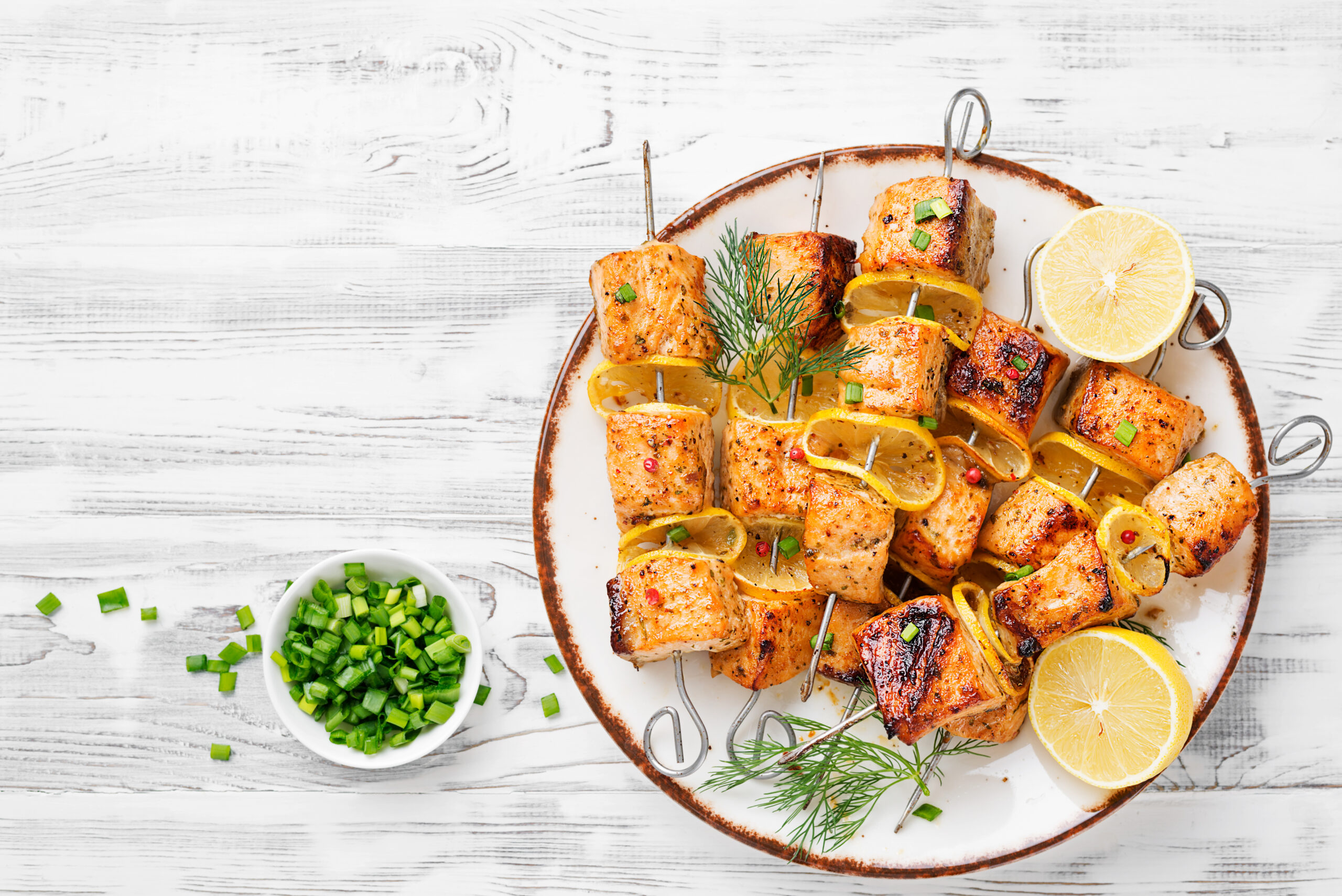 Serveer de zalmspiesjes met rijst, gegrilde groenten en de citroensaus.