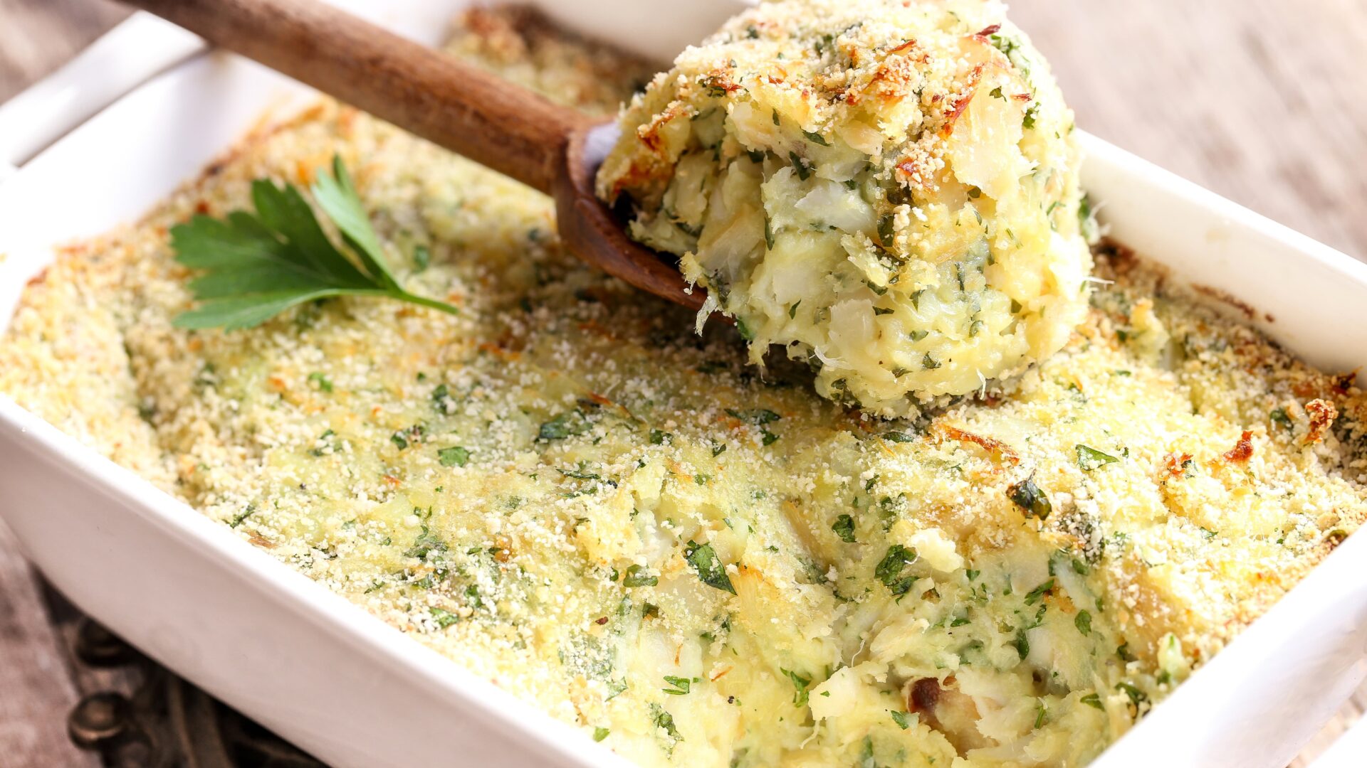 Étaler la brandade dans un plat allant au four. Parsemer de chapelure sur le dessus et arroser d’un filet d’huile d’olive.