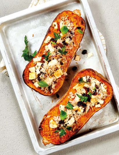 Dans un bol, mélanger le riz cuit, la feta, la menthe, les raisins et les pignons de pin. Saler et poivrer. Remplir les moitiés de butternut avec ce mélange.