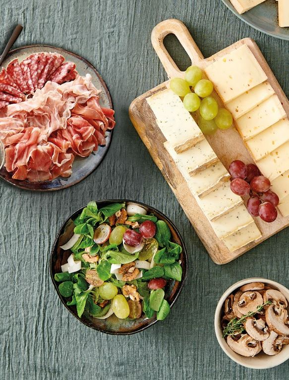 Présentez vos fromages sur un plateau accompagnés des fruits. Faites de même avec la charcuterie. Présentez les condiments dans des bols et les pommes de terre dans un saladier.