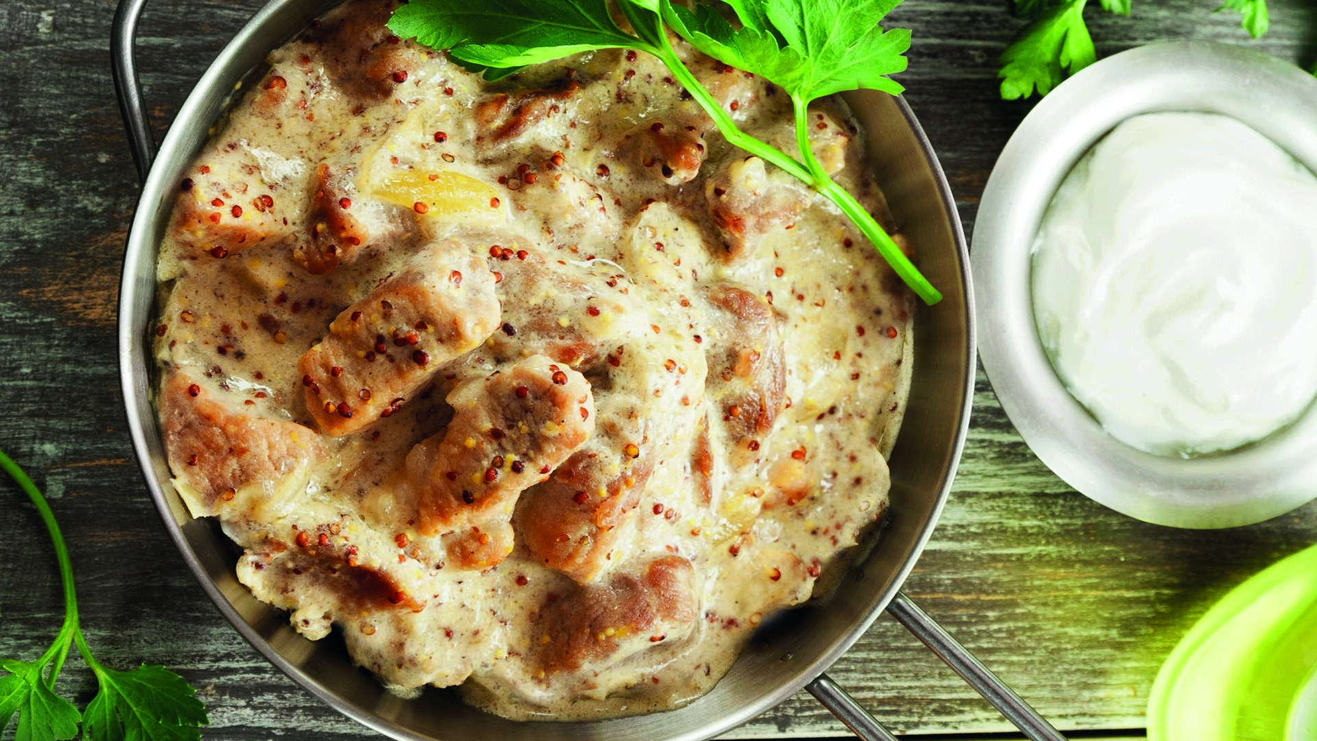 Coupez le rôti en tranches, dressez-le dans un plat et nappez de sauce à la moutarde. Accompagnez des chicons braisés, d’une salade vinaigrette et de pommes de terre nature.