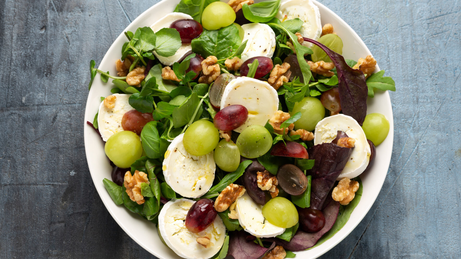Composez les assiettes de salade, raisins, chèvre et ajoutez les cerneaux de noix concassés.