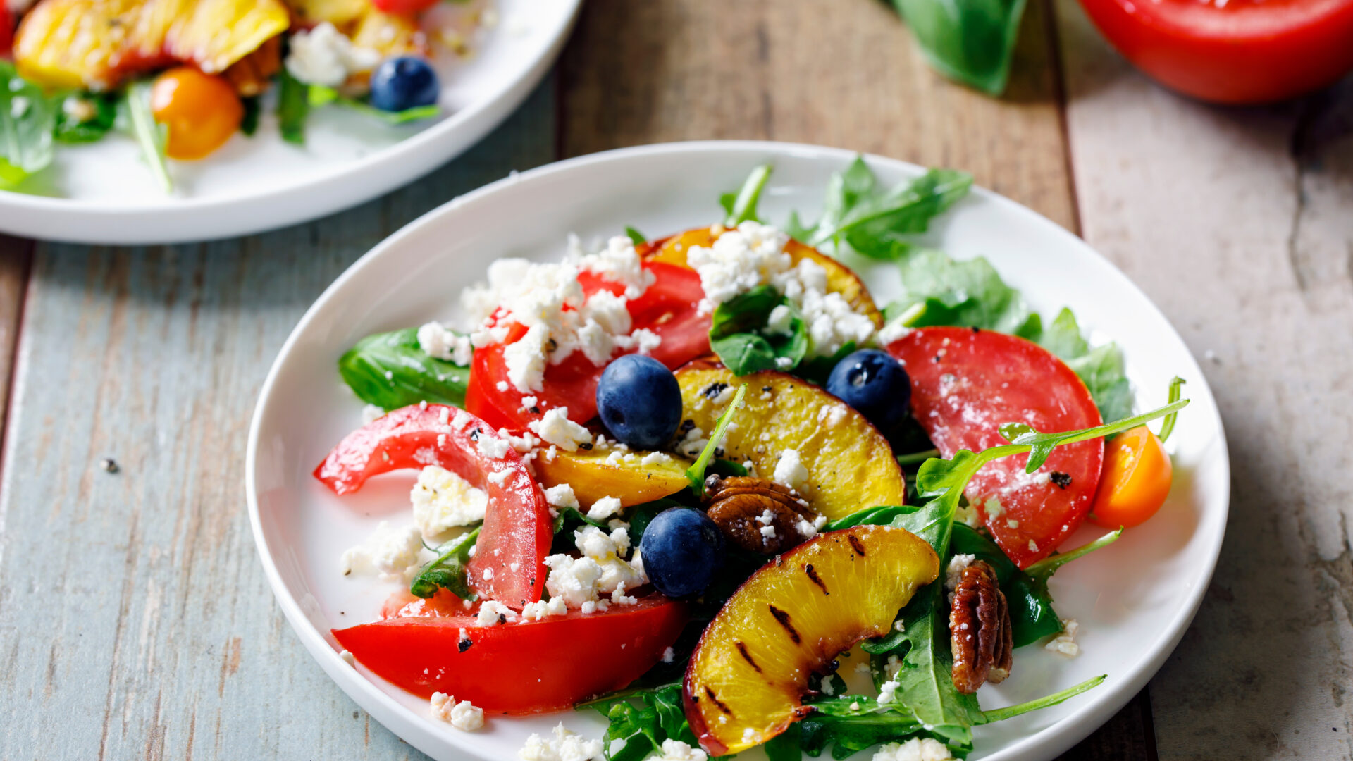 Il ne reste qu’à servir : déposez un lit de roquette dans chaque assiette, ajoutez les tomates, les pêches grillées, émiettez la feta et garnissez avec les myrtilles et le basilic.