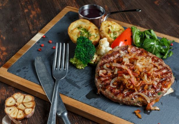 Servir les steaks hachés avec les oignons et lardons par-dessus. Accompagner de légumes natures et de pommes de terre.