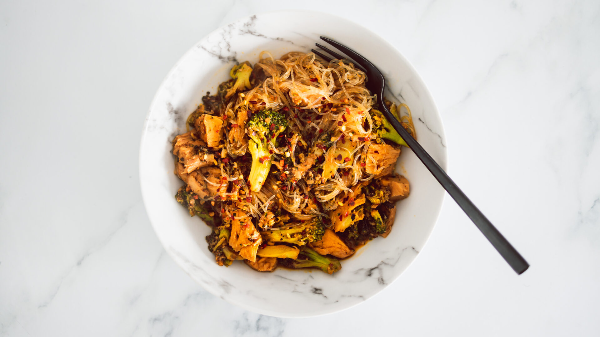Ajoutez les vermicelles et la sauce dans le wok de poulet aux légumes, mélangez l’ensemble et laissez cuire encore 5 minutes et servez bien chaud.
